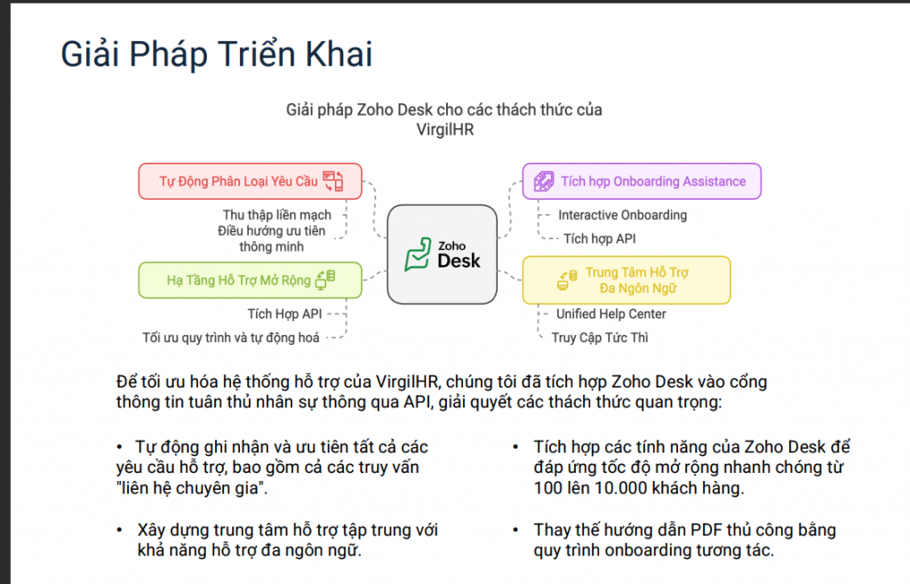 Để giải quyết bài toán “siêu tăng trưởng”, giải pháp không chỉ là cài đặt phần mềm, mà là tích hợp sâu qua API. Chúng tôi đã triển khai Zoho Desk trực tiếp vào cổng thông tin của VirgilHR.